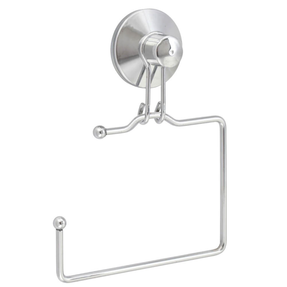 Portarrollo de pared con ventosa realizado en metal plateado, muy práctico para evitar realizar agujeros en la pared.