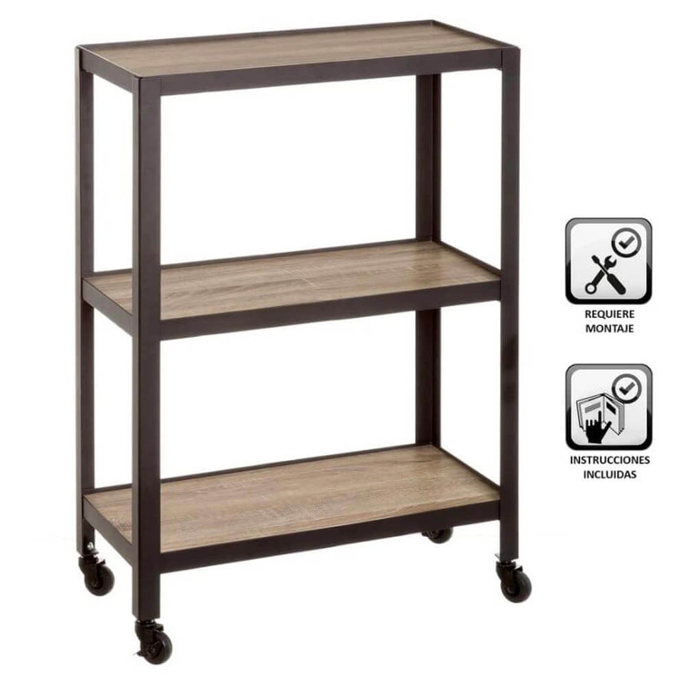 Estantería metálica con estructura de acero negro y baldas de madera MDF. La estantería auxiliar lleva cuatro ruedas en las patas para facilitar su transporte, cada balda de MDF soporta hasta 10 kg, perfecta como estantería para organizar la oficina, despacho, para el salón, pasillo, etc.