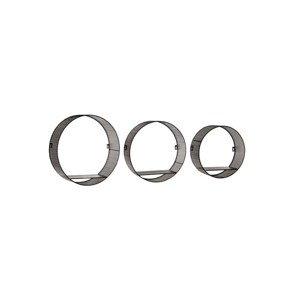 Conjunto de 3 estanterías redondas para colgar en la pared de Ø25 cm, Ø30 cm y Ø35 cm fabricadas en hierro pintado de color negro mate. Diseño sencillo, formado por una estructura redonda micro-perforada y un práctico estante para colocar pequeños objetos de decoración, marcos de fotos, velas, plantas, etc.
