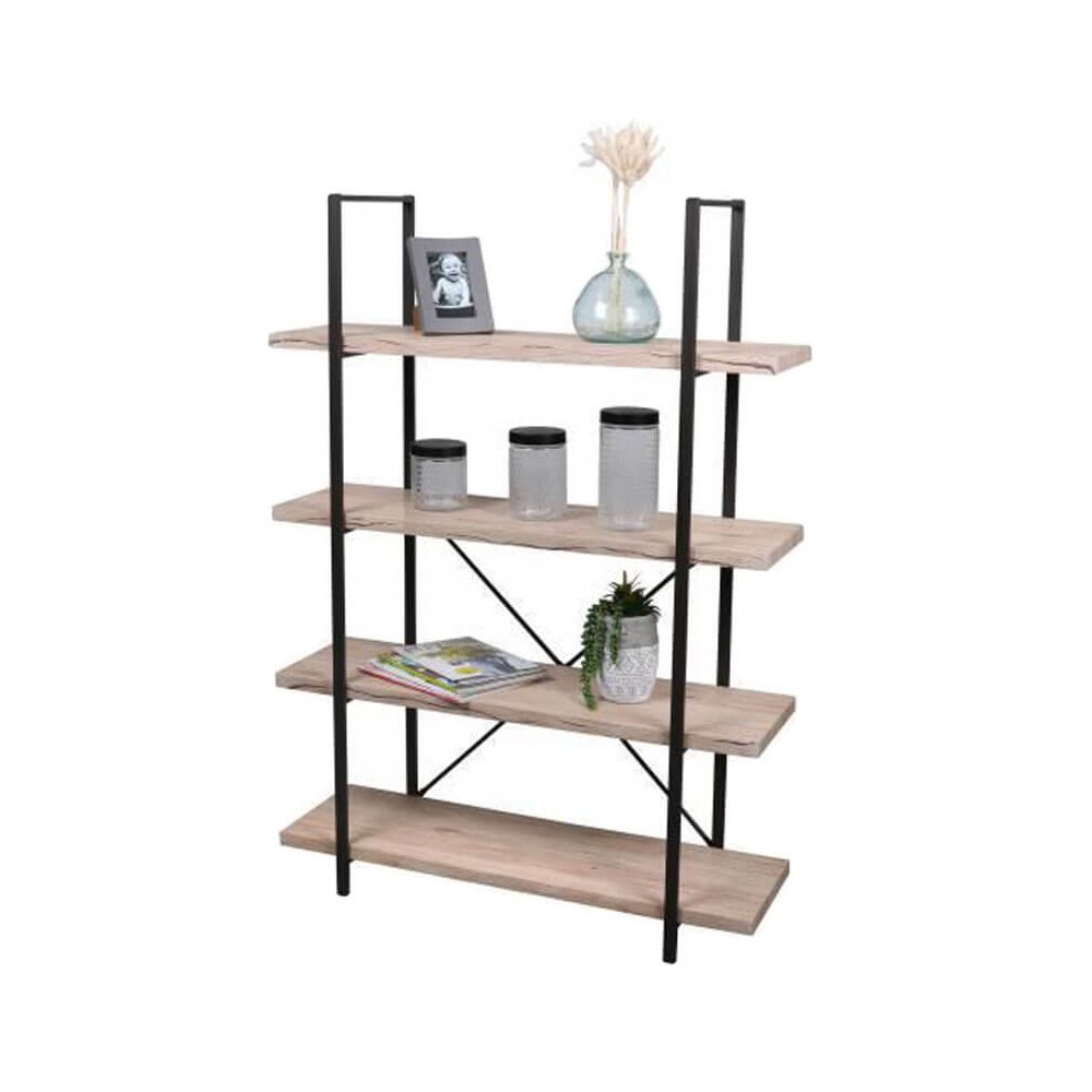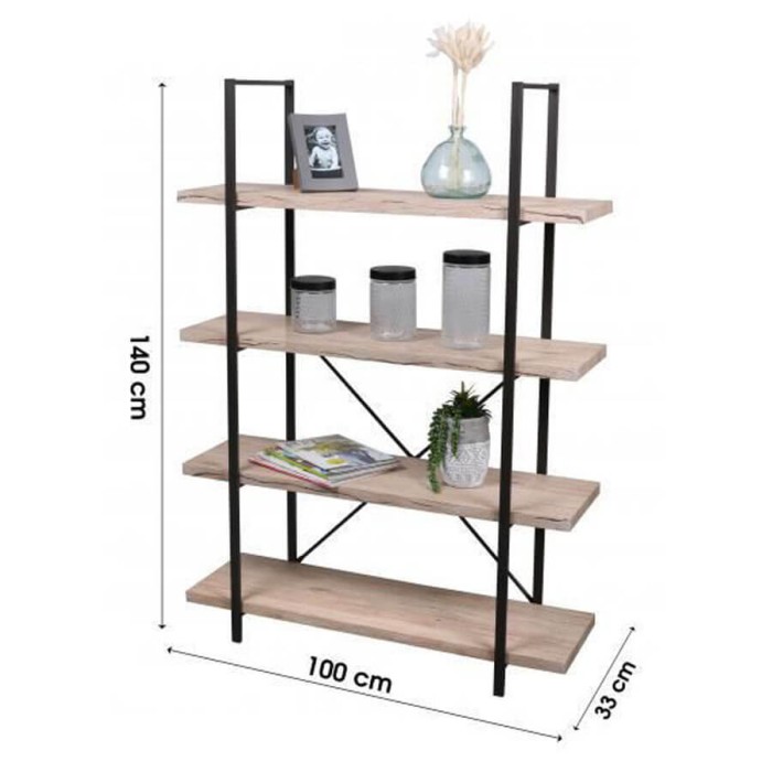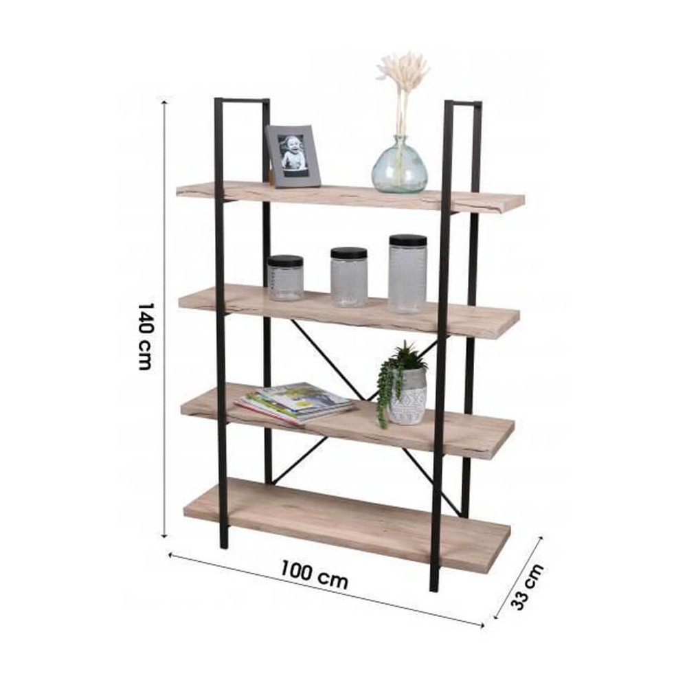 Estantería de 140 cm de altura con estructura resistente de acero negro, cuenta con cuatro baldas de PVC con impresión de madera. Una estantería actual ideal para decorar salones, comedores y recibidores. Requiere montaje.