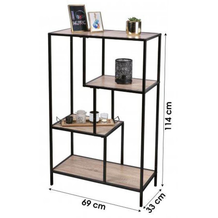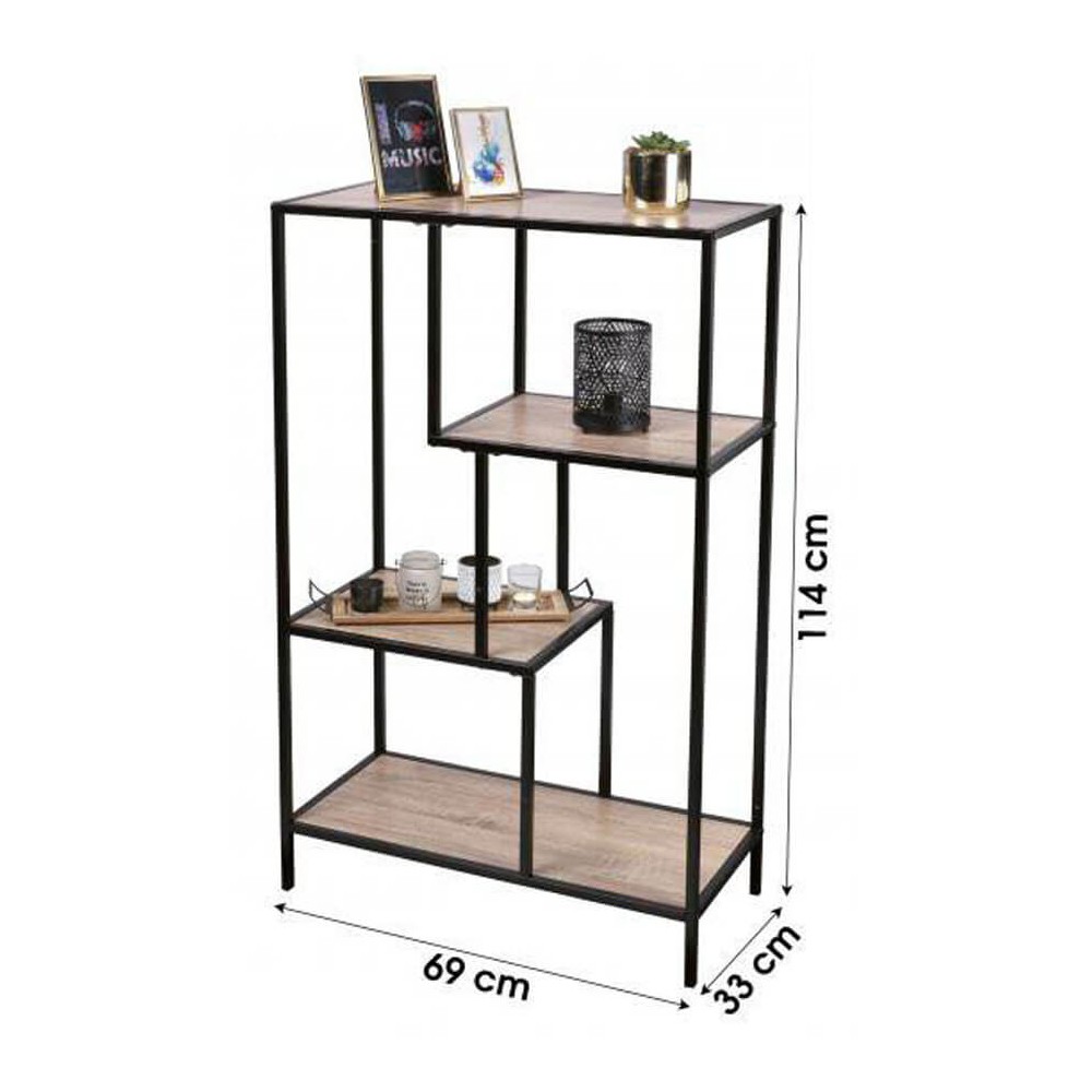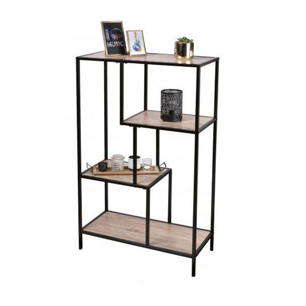 Estantería auxiliar de 114 cm de altura con cuerpo de acero negro, lleva dos baldas completas y entre medidas dos medias baldas a diferente altura realizadas en madera MDF de color natural.