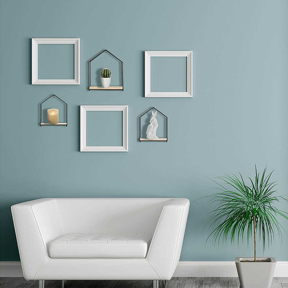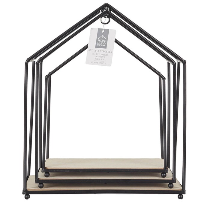Set de estanterías con estructura metálica en forma de casa y balda de madera MDF, perfectas para decorar la pared con libros o artículos personales.
