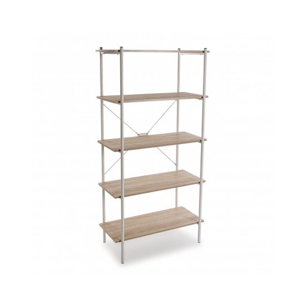 Estantería metálica recubierta de pintura blanca con 5 estantes abiertos de madera mdf en color natural.