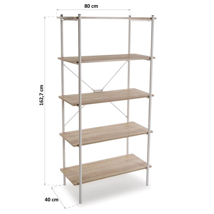 Estantería de 162,7 cm de altura con estructura tubular metálica recubierta de pintura blanca, cuenta con 5 baldas fijas en altura realizadas en madera mdf de color natural con acabado de vetas para mayor realismo.