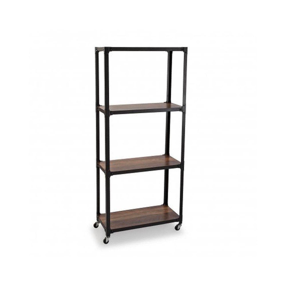Estantería metálica negra de estilo industrial con 4 estantes abiertos de madera mdf y ruedas para un transporte fácil.