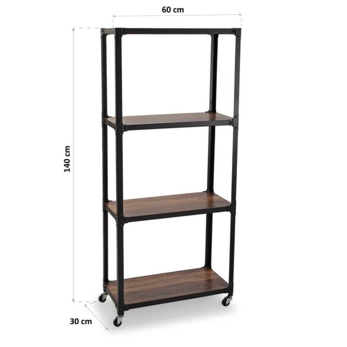 Estantería de estilo industrial de 140 cm de altura con estructura metálica acabado negro, cuenta con 4 baldas fijas en altura realizadas en madera mdf y ruedas para un transporte fácil, sin necesidad de realizar esfuerzos.