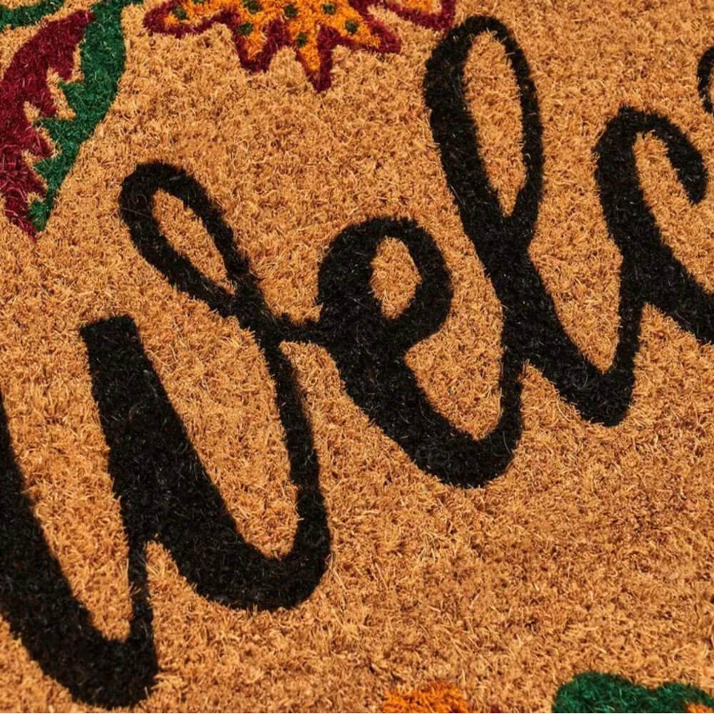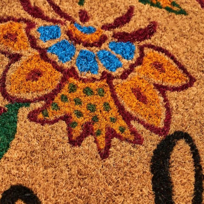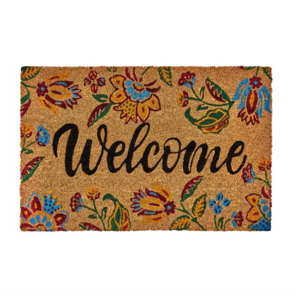 Elimina la suciedad de la suela de tu calzado antes de entrar en casa para evitar introducir barro, tierra y polvo con este felpudo original en fibra de coco con base de PVC antideslizante con la superficie decorada con flores y la palabra Welcome sobre fondo natural.