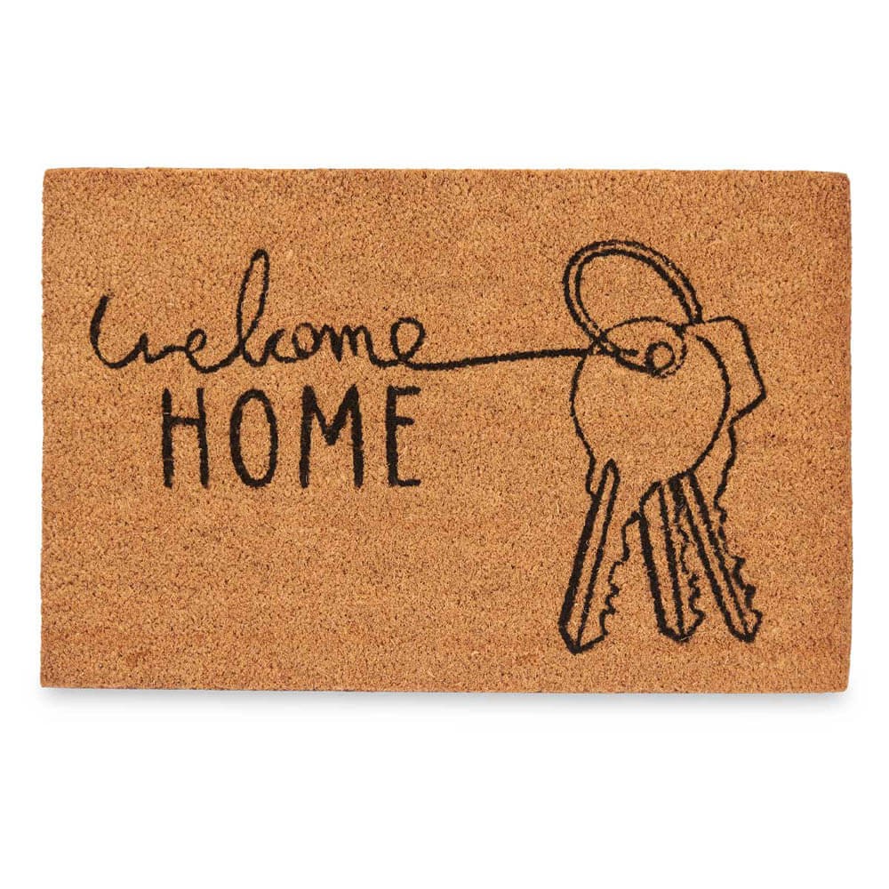 Felpudo de coco de 60x40 cm con base de goma antideslizante, decorado en negro con llaves y la frase "Welcome Home". Ideal para mantener la entrada limpia y acogedora.
