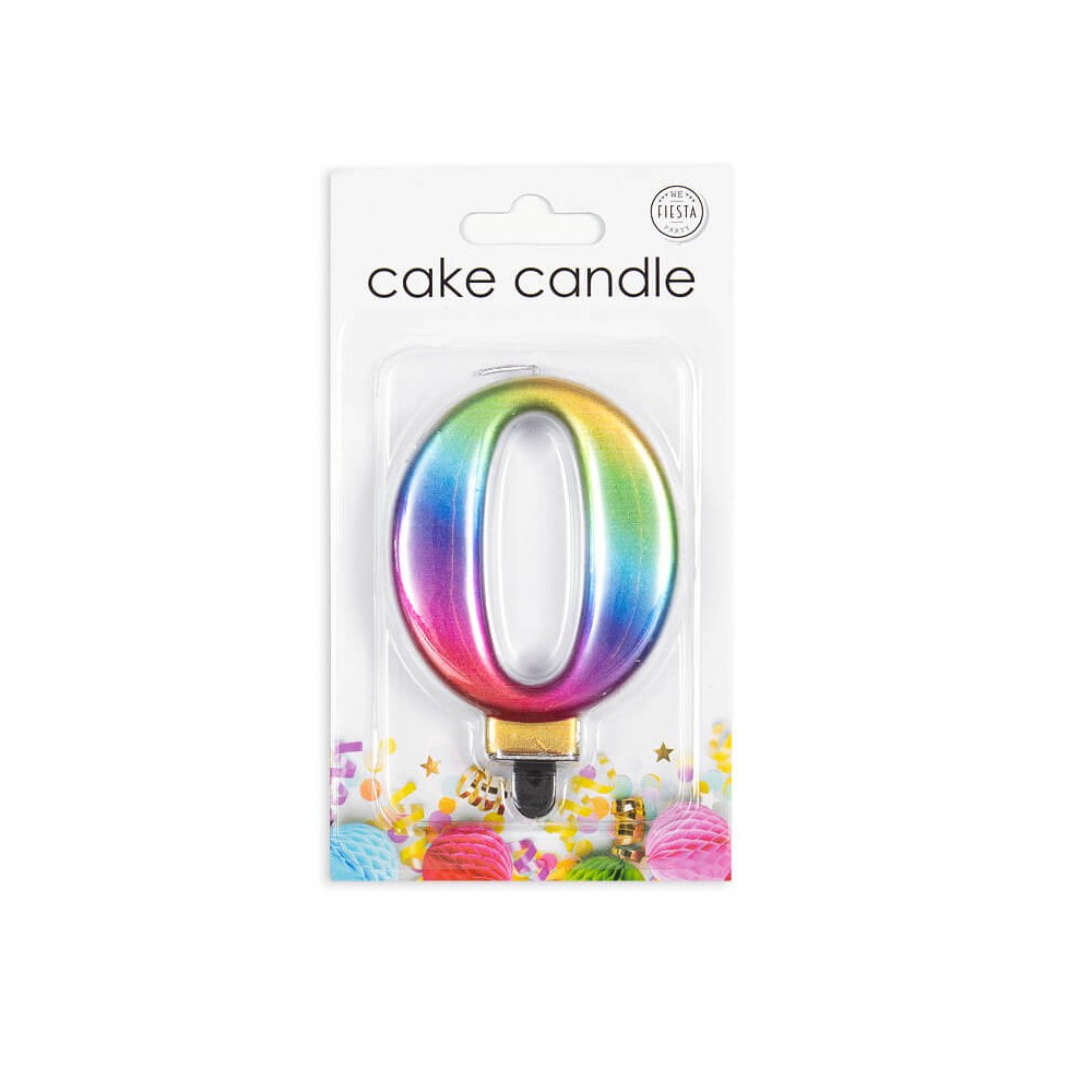 Vela cumpleaños en color arcoíris con forma de número "0".