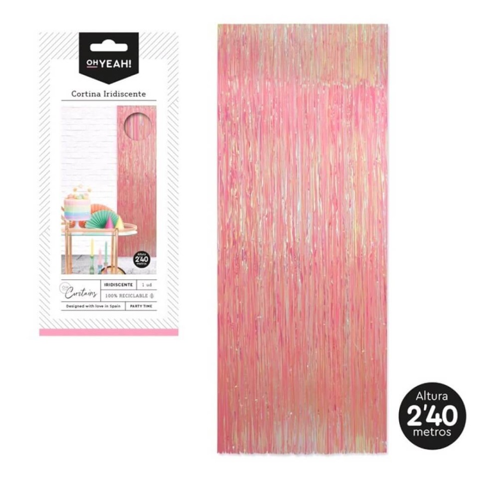 Cortina para fiestas fabricada en papel de aluminio metalizado en color rosa iridescente, perfecta para decorar fiestas y eventos.