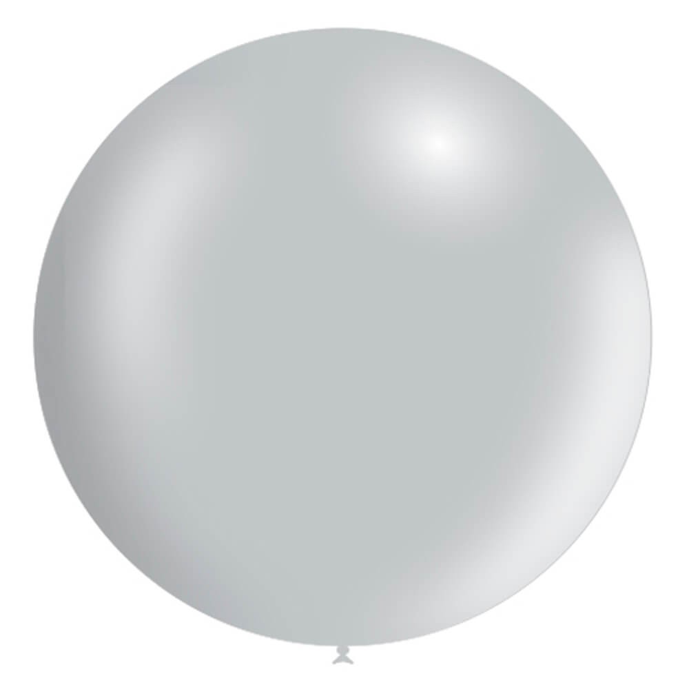 Globo gigante en forma de bola de 87 cm, fabricado 100% en látex biodegradable de color plata acabado metalizado, perfecto para realizar decoraciones con globos en fiestas y eventos.