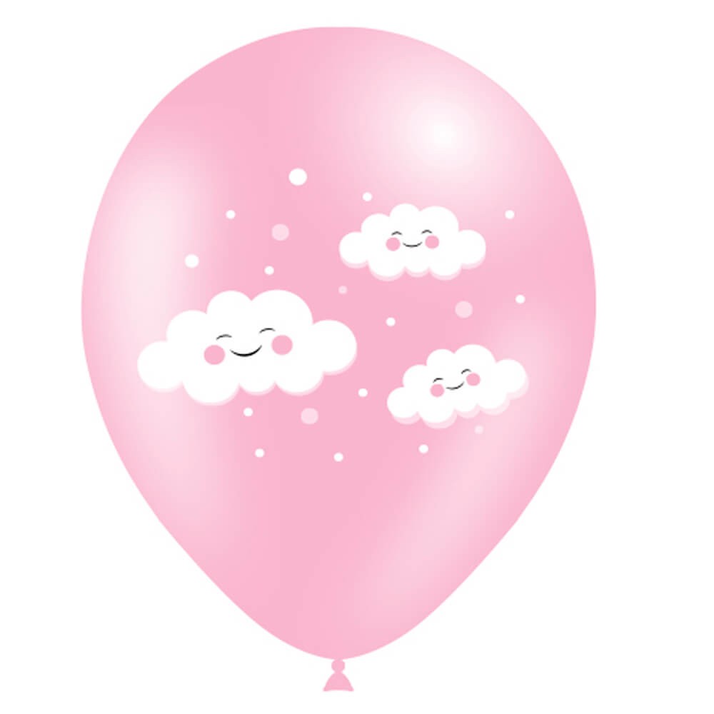 Estos globos impresos con nubes blancas con caritas sobre fondo rosa son ideales para decorar fiestas y eventos infantiles, babyshowers, bautizos, comuniones y cumpleaños, combínalos con otros globos para conseguir una decoración impactante.