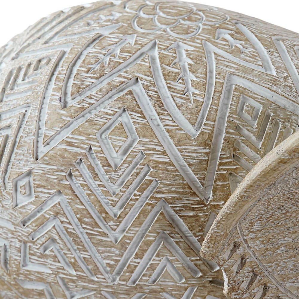 Figura de elefante con la trompa hacia arriba fabricada en resina de color beige acabado decape blanco imitación madera con un bonito trabajo tallado de estilo étnico, ideal para decorar estancias y realzar muebles y estanterías.