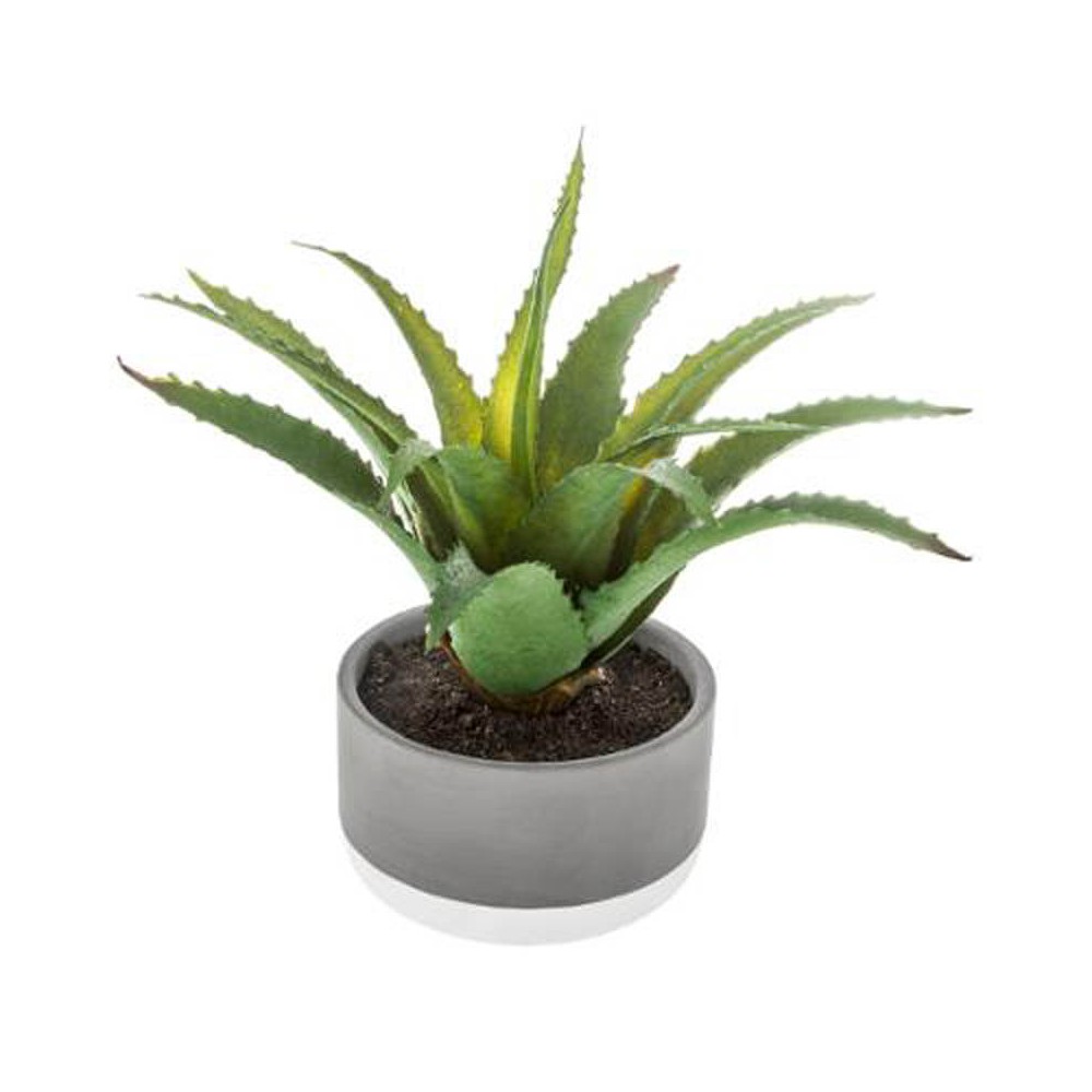 Planta artificial realizada en polietileno resistente con maceta de cemento, diseño moderno en color gris con la base blanca. 2 modelos de suculentas según disponibilidad.