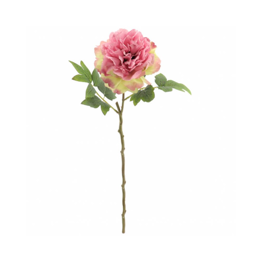 Vara de peonía con una flor artificial en color rosa y hojas verdes.