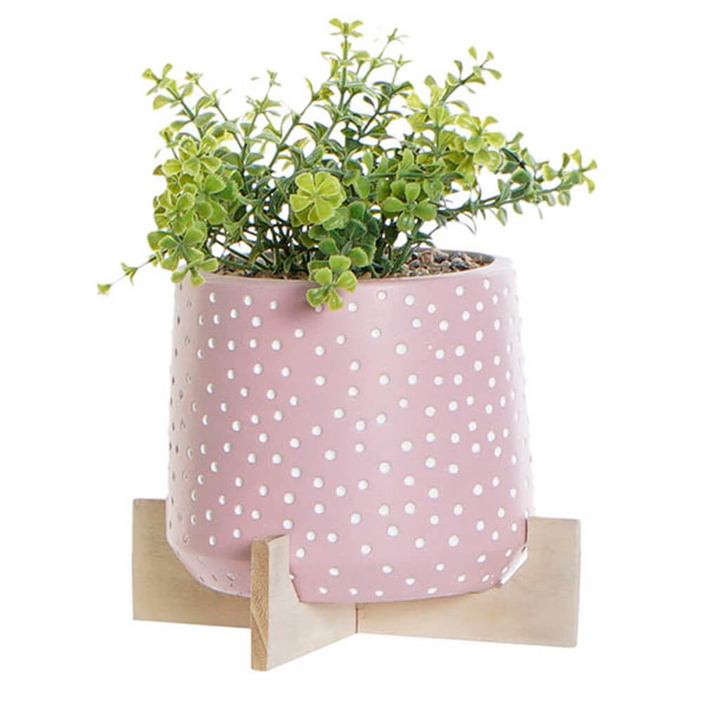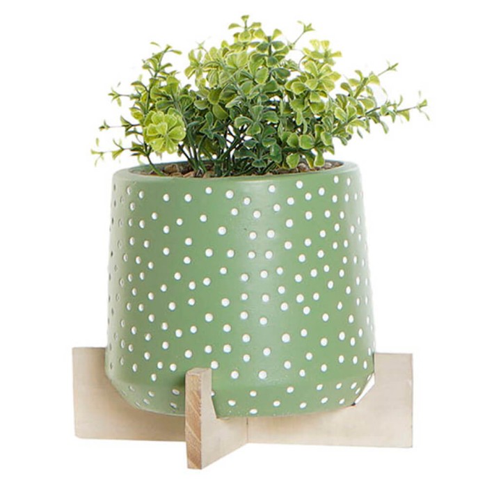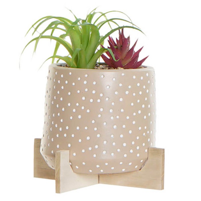 Maceta de cemento en color verde, rosa, beige o gris con muescas blancas, base de madera y planta artificial de PE.