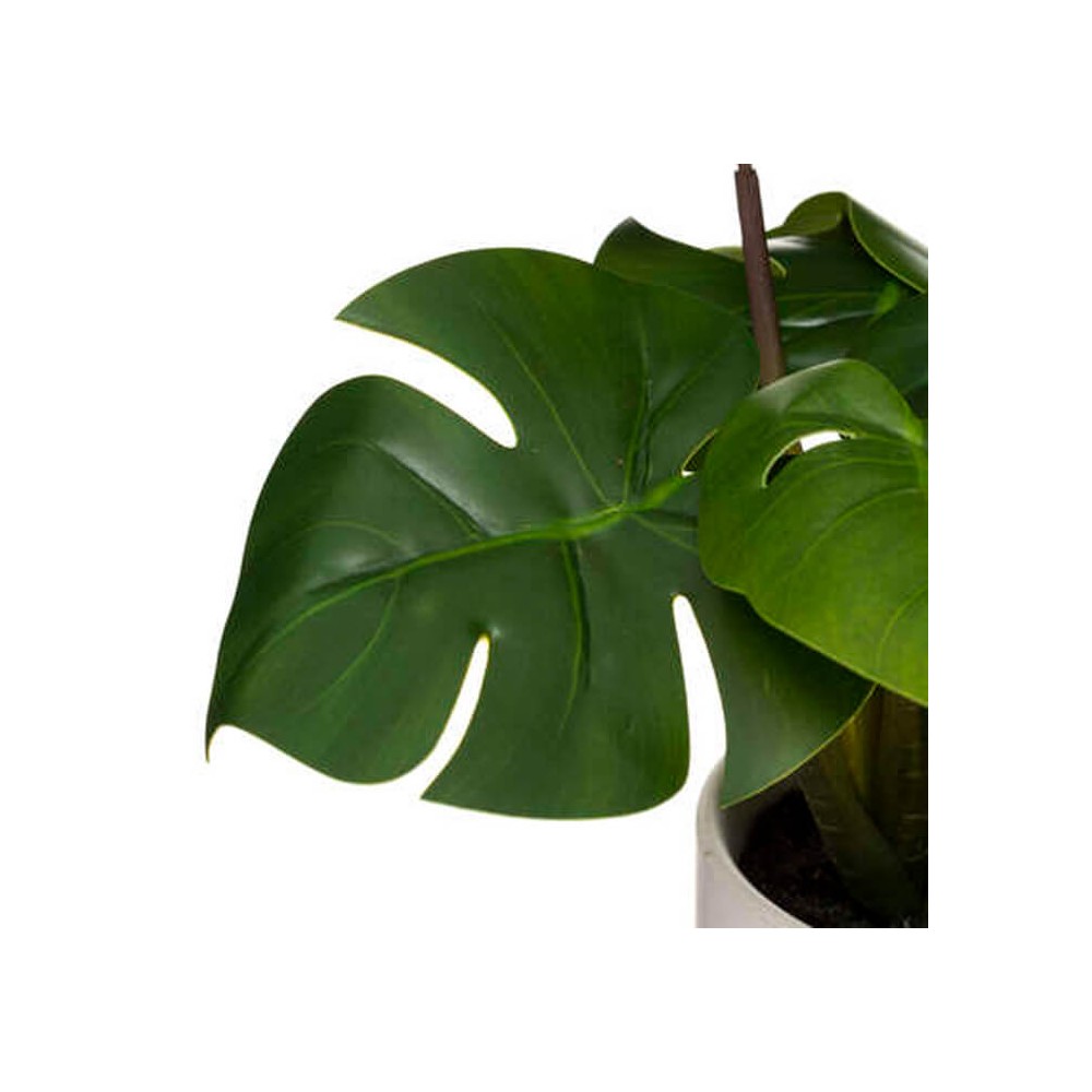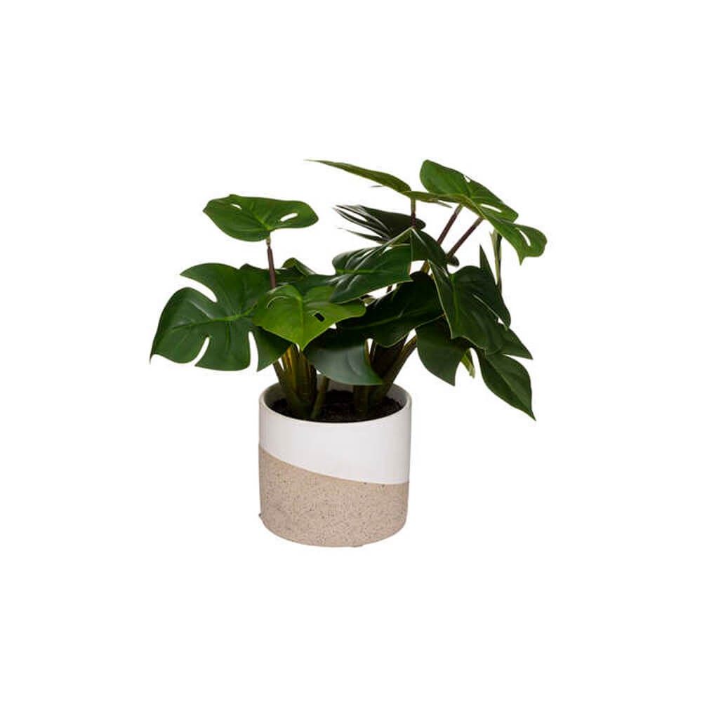 Planta artificial con hojas de monstera realizadas en poliestireno resistente dentro de una maceta de cerámica gres con un original diseño bicolor de estilo moderno.