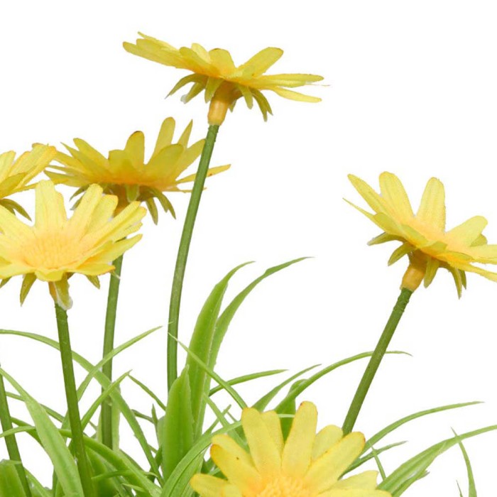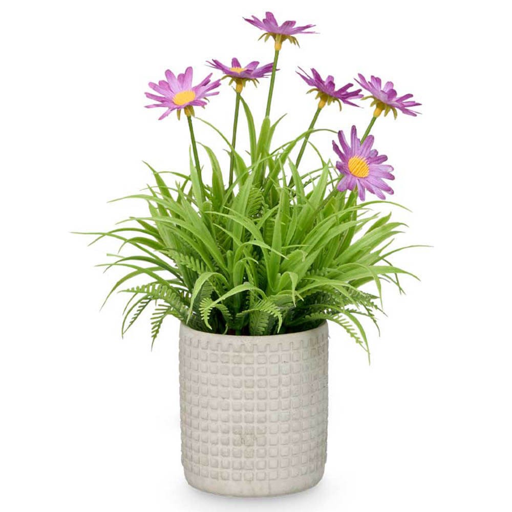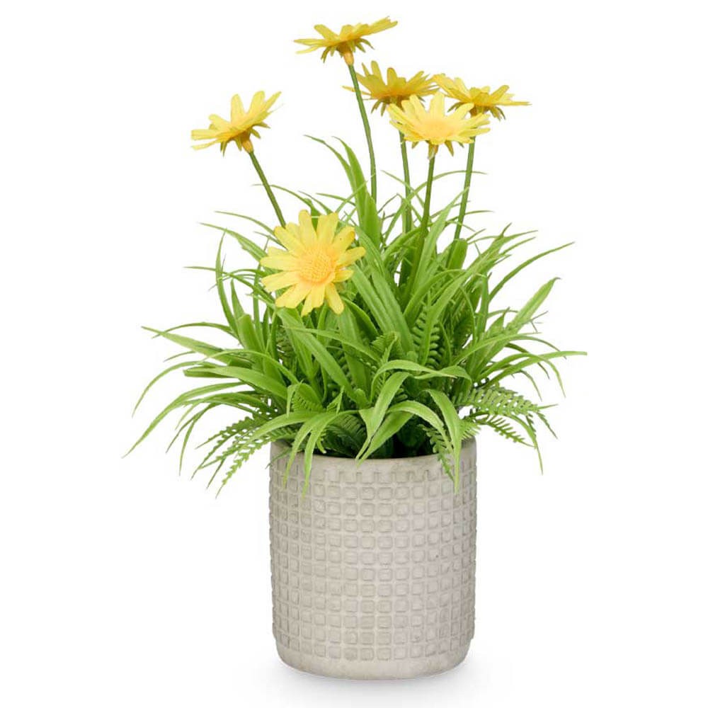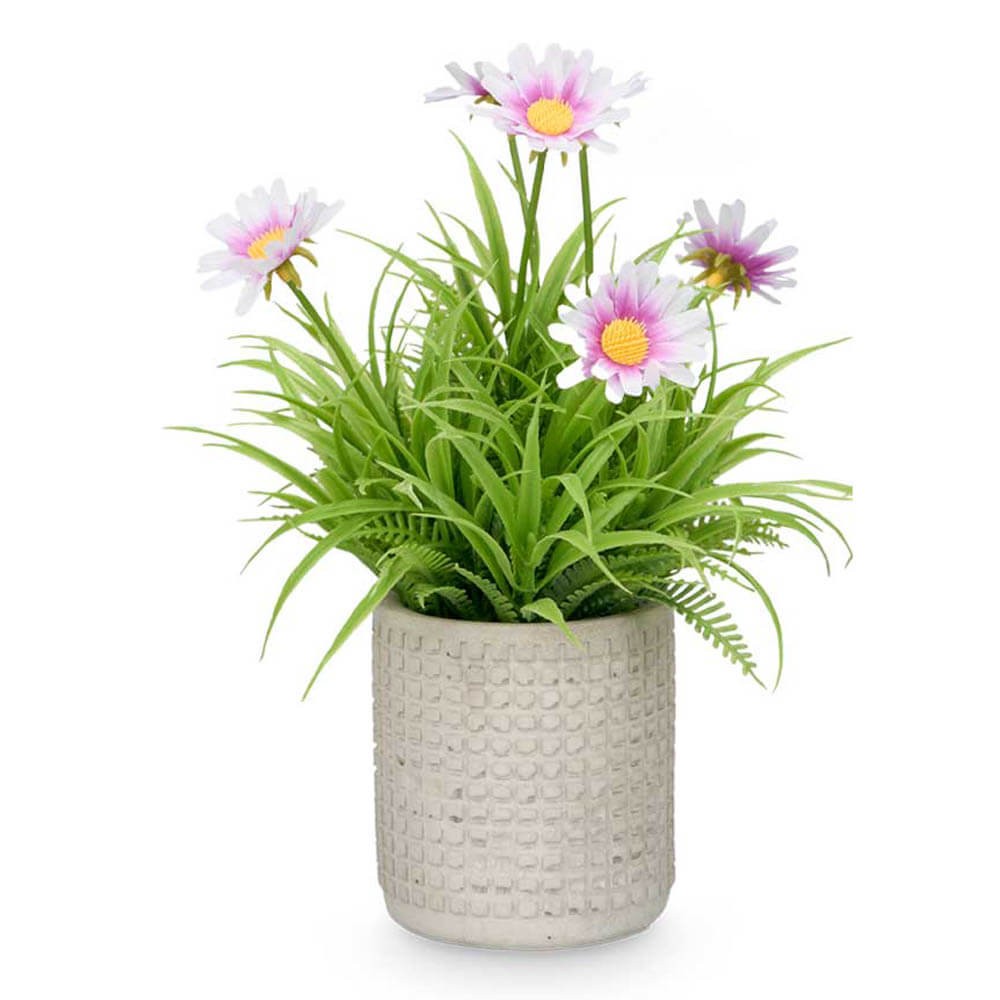 Añade color y frescura a tu hogar sin necesidad de ningún mantenimiento con estas hermosas margaritas artificiales en color blanco, rosa, amarillo o blanco y rosa, con maceta de cemento gris en relieve.