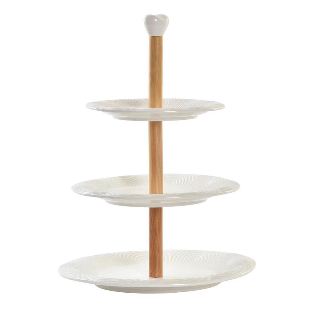 Su diseño formado por tres platos de diferente diámetro en porcelana de color blanco colocados sobre un eje de madera de bambú aportara un toque cálido y acogedor a tu cocina.