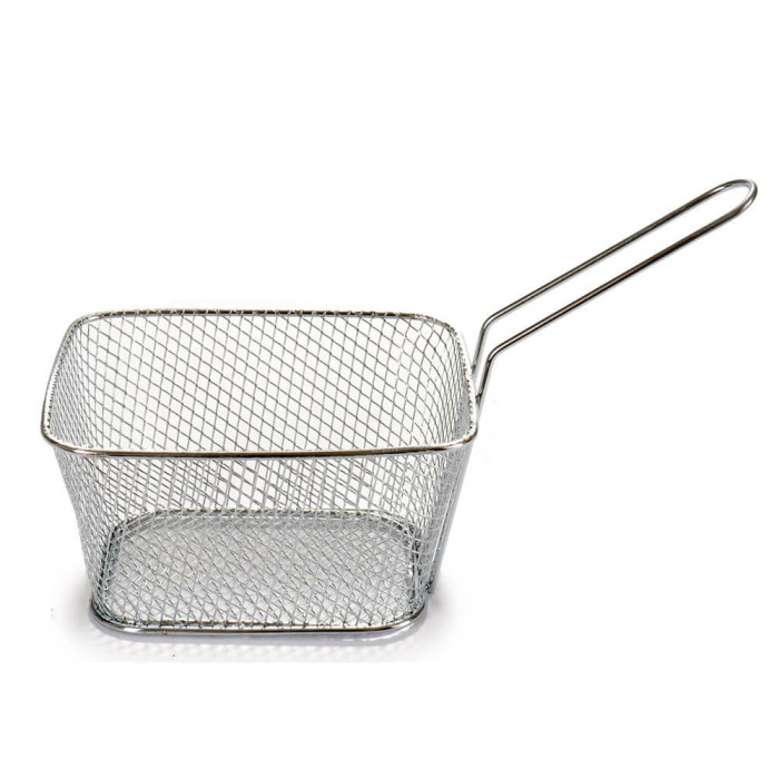Realizada en metal de alta calidad, esta cesta es resistente y duradera, apta para el contacto directo con alimentos. Su diseño abierto de rejilla no solo asegura que tus alimentos se mantengan crujientes y deliciosos, sino que también proporciona una presentación atractiva y profesional, ideal para impresionar a tus invitados.