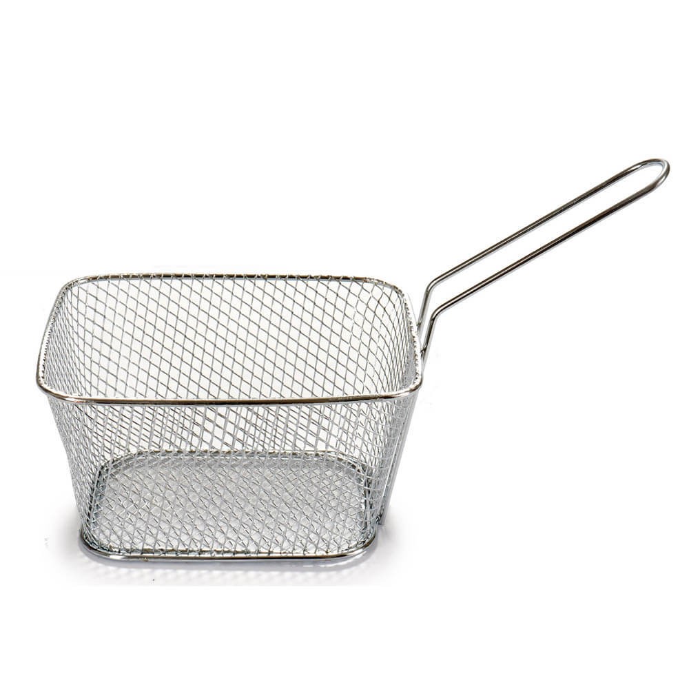 Cesta de rejilla metálica para aperitivos. Ideal para nuggets, patatas y más. Diseño moderno con asa grande. Apta para alimentos, resistente y duradera.