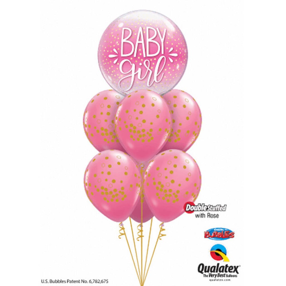 Globo baby shower niña en forma de burbuja, fabricado en plástico elástico decorado con una moderna tipografía y lunares.