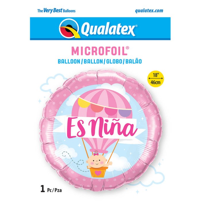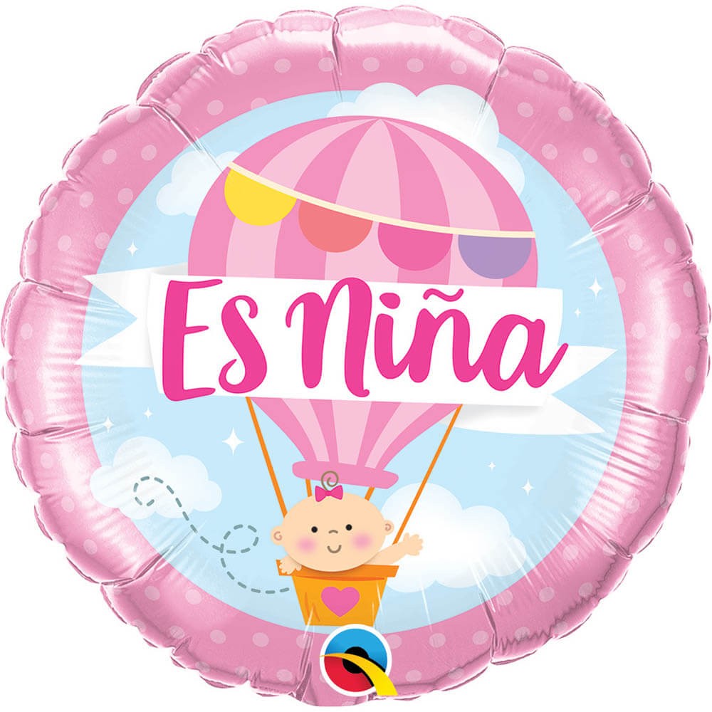 Globo de foil redondo con mensaje "Es una niña" sobre un maravilloso diseño de un globo aerostático con un bebe dentro, lleva el fondo azul con nubes y el borde rosa con lunares, perfecto para decorar fiestas de baby shower de niña o de revelación de sexo.