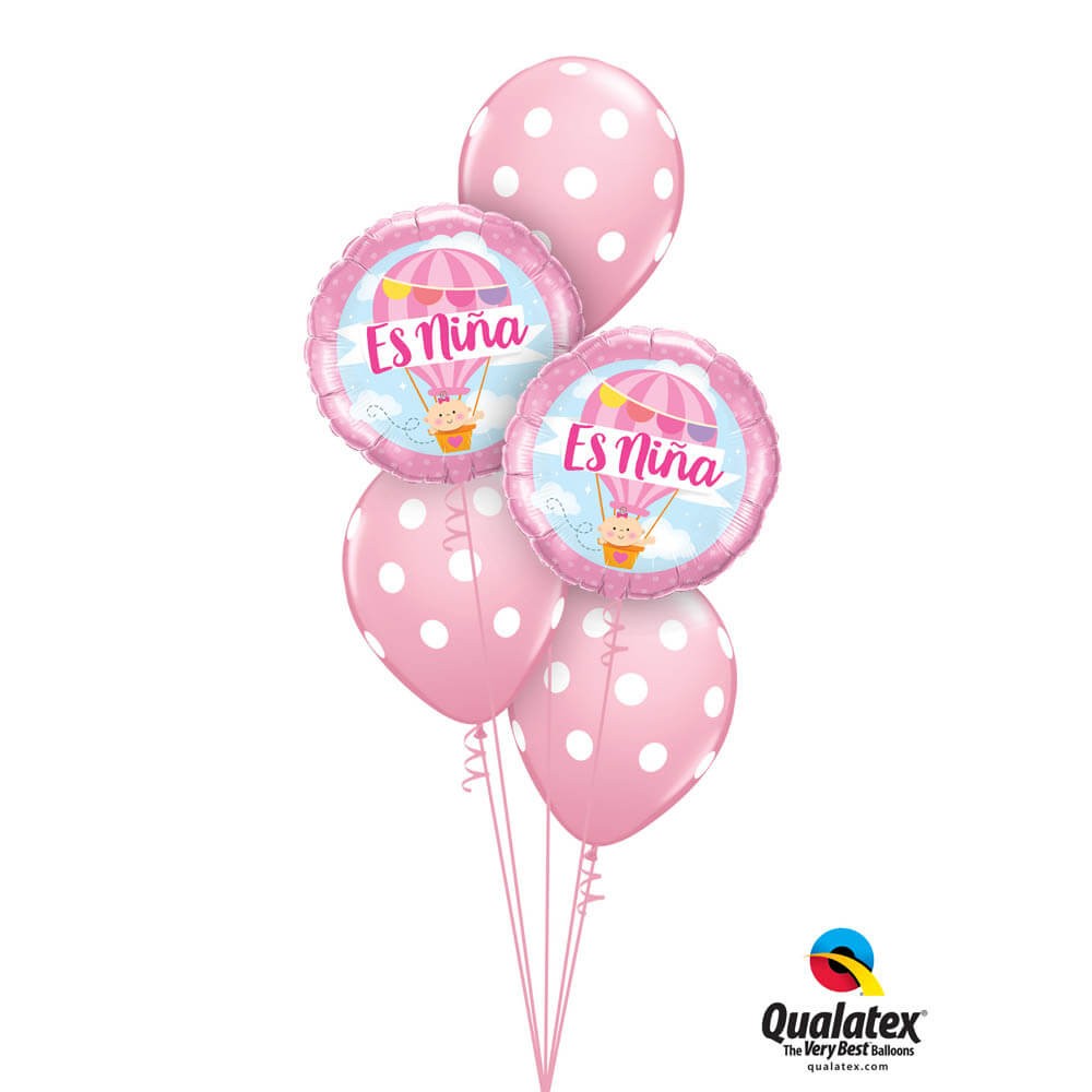 Globo baby shower niña decorado con un globo aerostático sobre fondo de nubes y lunares, diseño adorable, perfecto para decorar fiestas de baby shower.