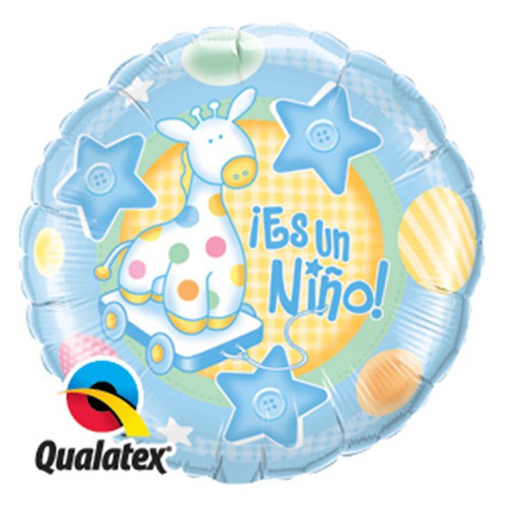 Globo baby shower niño diseño jirafa con mensaje "es un niño" en color azul, perfecto para decorar fiestas de baby shower de niño.