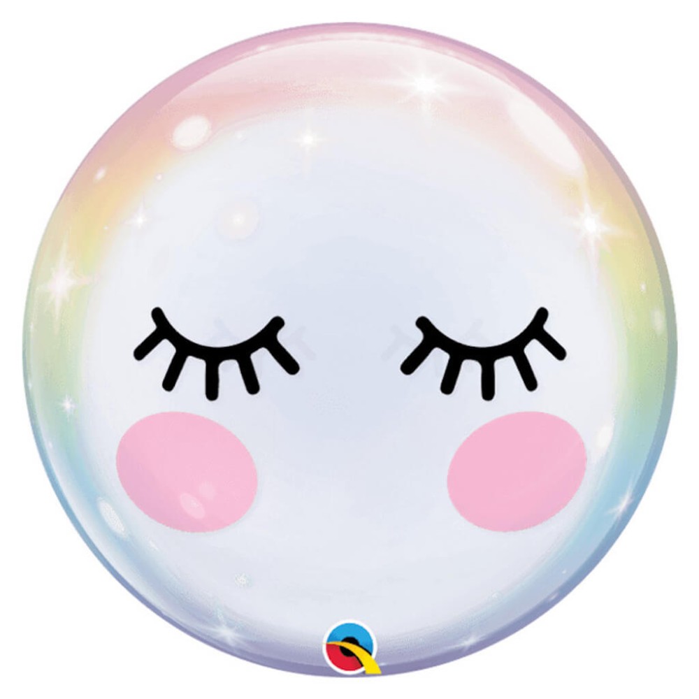 Globo redondo decorado con pestañas y coloretes sobre un fondo transparente con reflejos multicolor, ideal para realizar una decoración innovadora para fiestas de baby shower, unicornio, etc.