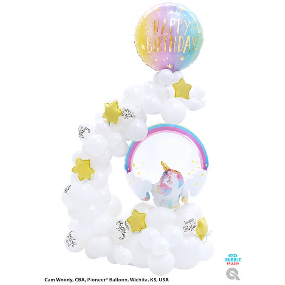 El globo burbuja de la marca Qualatex tiene un fantástico diseño transparente que permite ver el contenido, coloca un globo en el interior, globos de números y unicornios al rededor para realizar un ramo de globos mágico para decorar el cumpleaños de tu hija. Es un globo único en el que puedes meter globos, purpurina, flores y mucho más para crear una decoración innovadora e impactante.
