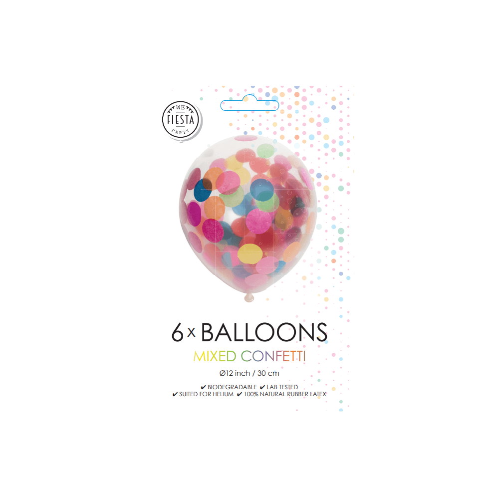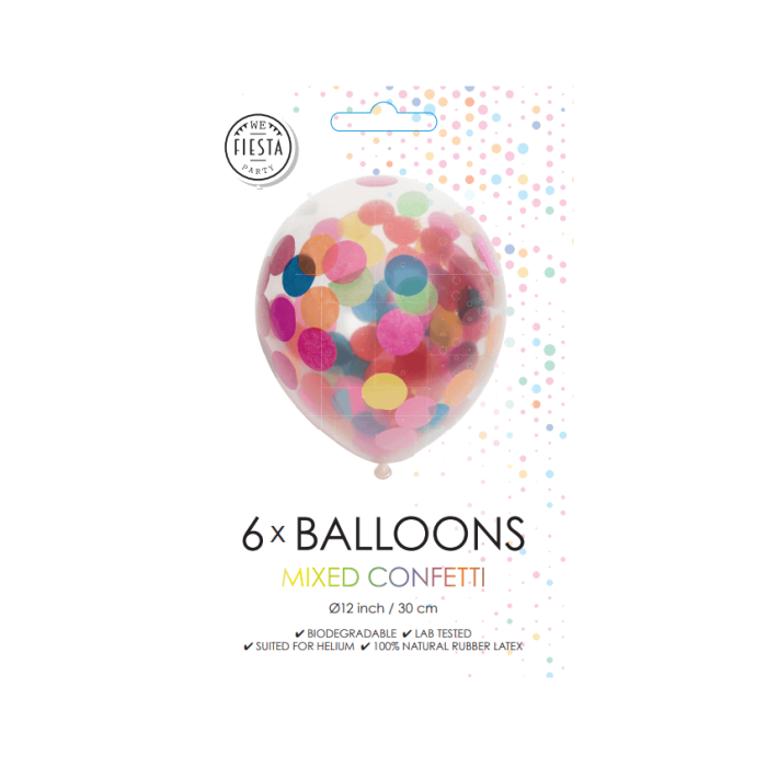 Paquete con 6 globos con confeti de papel en colores surtidos para que decores todo tipo de fiestas y eventos.