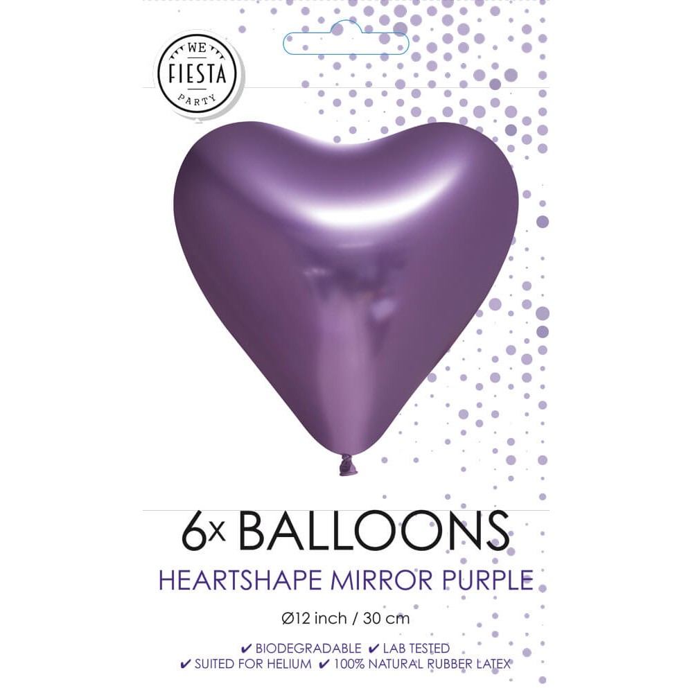 Paquete con 6 globos de látex de 30cm en forma de corazón de color purpura cromado con un espectacular acabado espejo, biodegradables y aptos para helio o aire. Ideales para decorar cualquier evento.