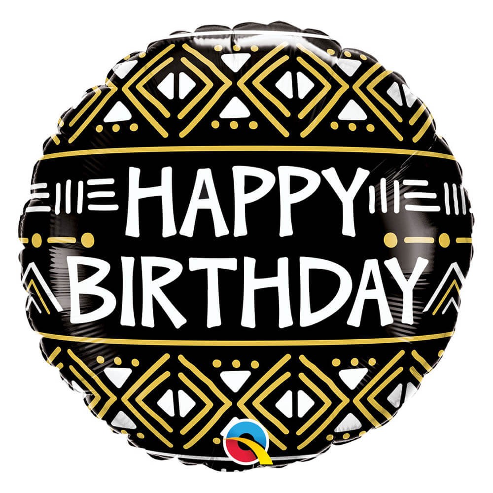 Globo de foil redondo con mensaje "Happy Birthaday" sobre fondo negro con dibujos geométricos, idóneo para decorar fiestas de cumpleaños.