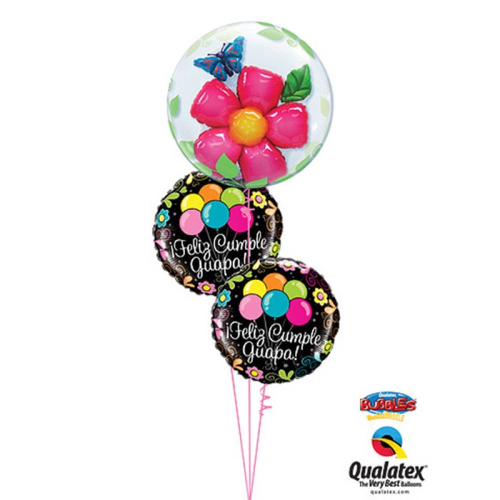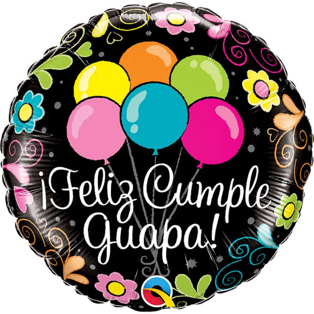 Globo cumpleaños con mensaje ¡Feliz cumple guapa! sobre fondo negro con ramo de globos y corona de flores, idóneo para decorar fiestas de cumpleaños.