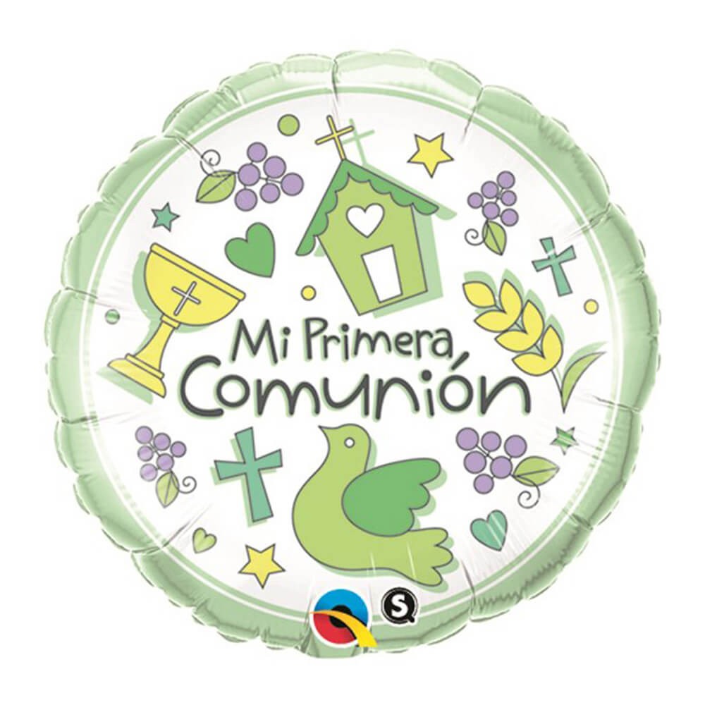 Globo de foil con mensaje "Mi primera comunión" en formato redondo con un simpático diseño en tonos verdes decorado con ilustraciones de símbolos de la comunión cristiana, paloma de la paz, cáliz, uvas, trigo, etc. Perfecto para decorar un evento tan especial como es la comunión de tu hijo o hija.