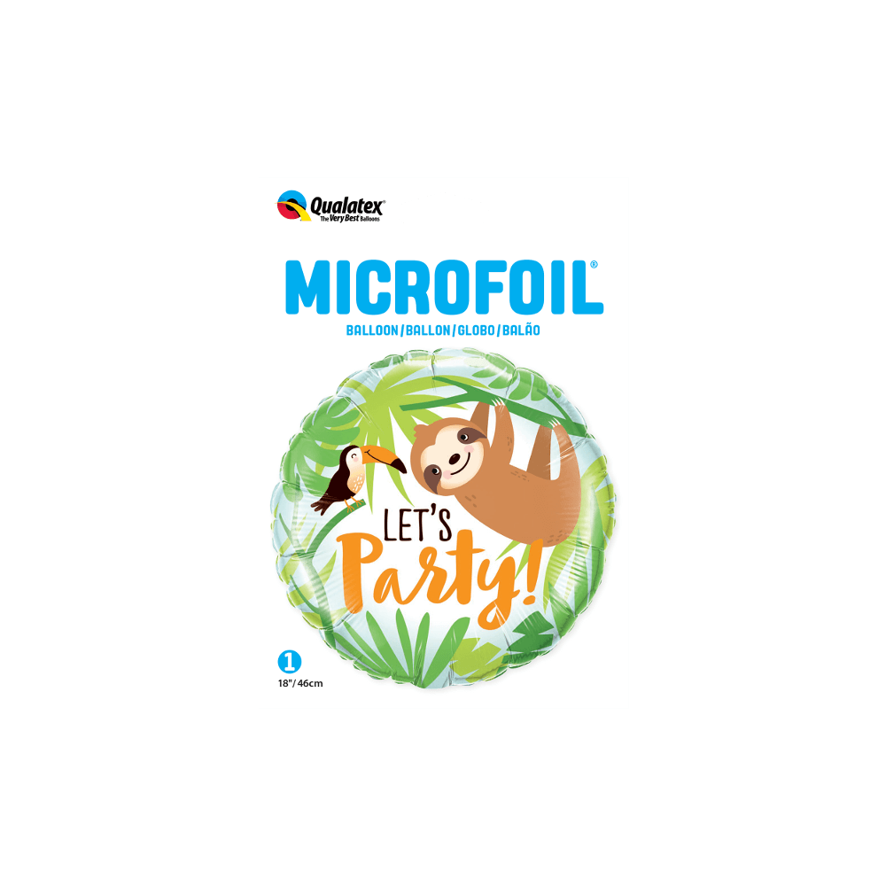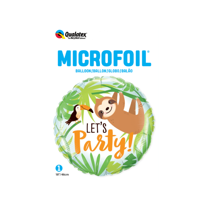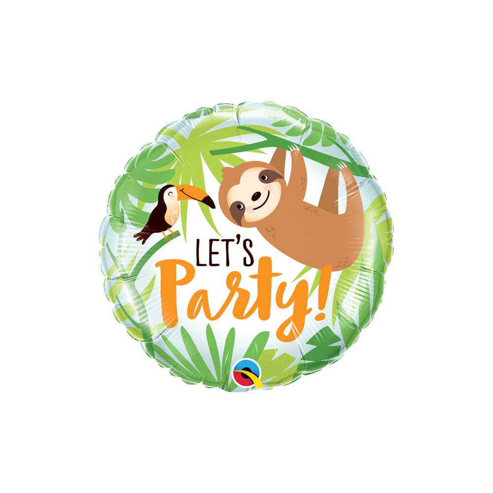 Globo de foil con mensaje "Let's party" en formato redondo con un simpático decorado de hojas tropicales en tonos verdes, un oso perezoso y un Tucan, perfecto para decorar fiestas y eventos.
