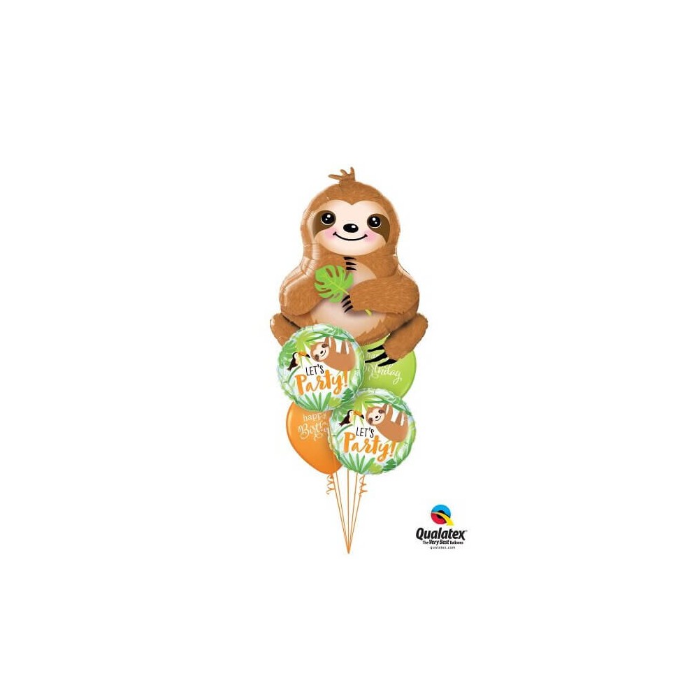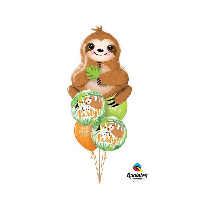 Globo de foil diseño Let's Party en tonos verdes y naranjas decorado con hojas tropicales, un oso perezoso y un tucan.