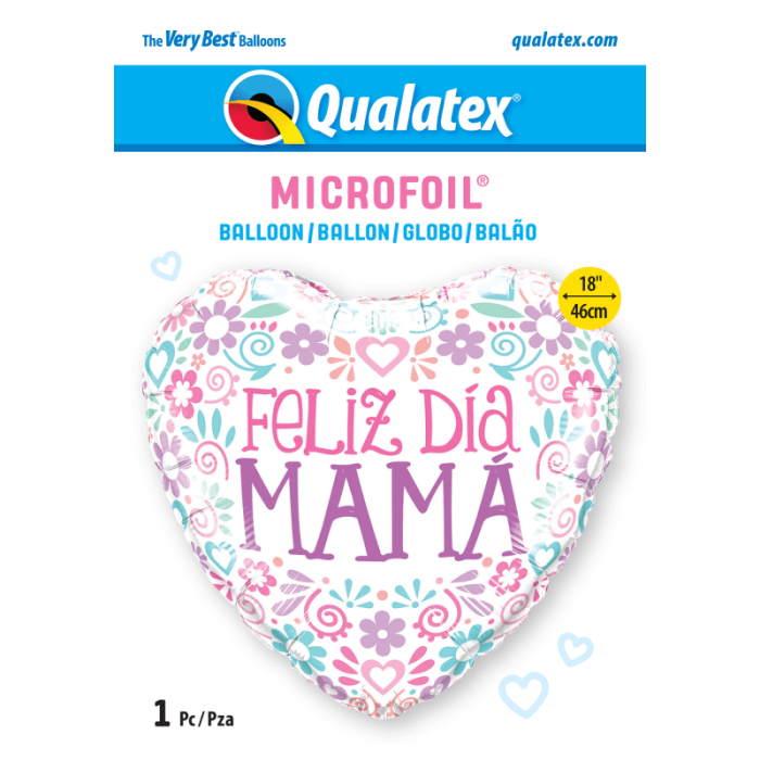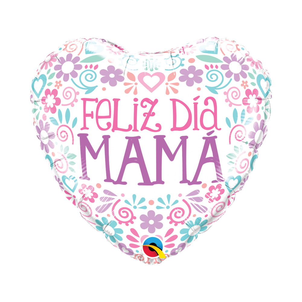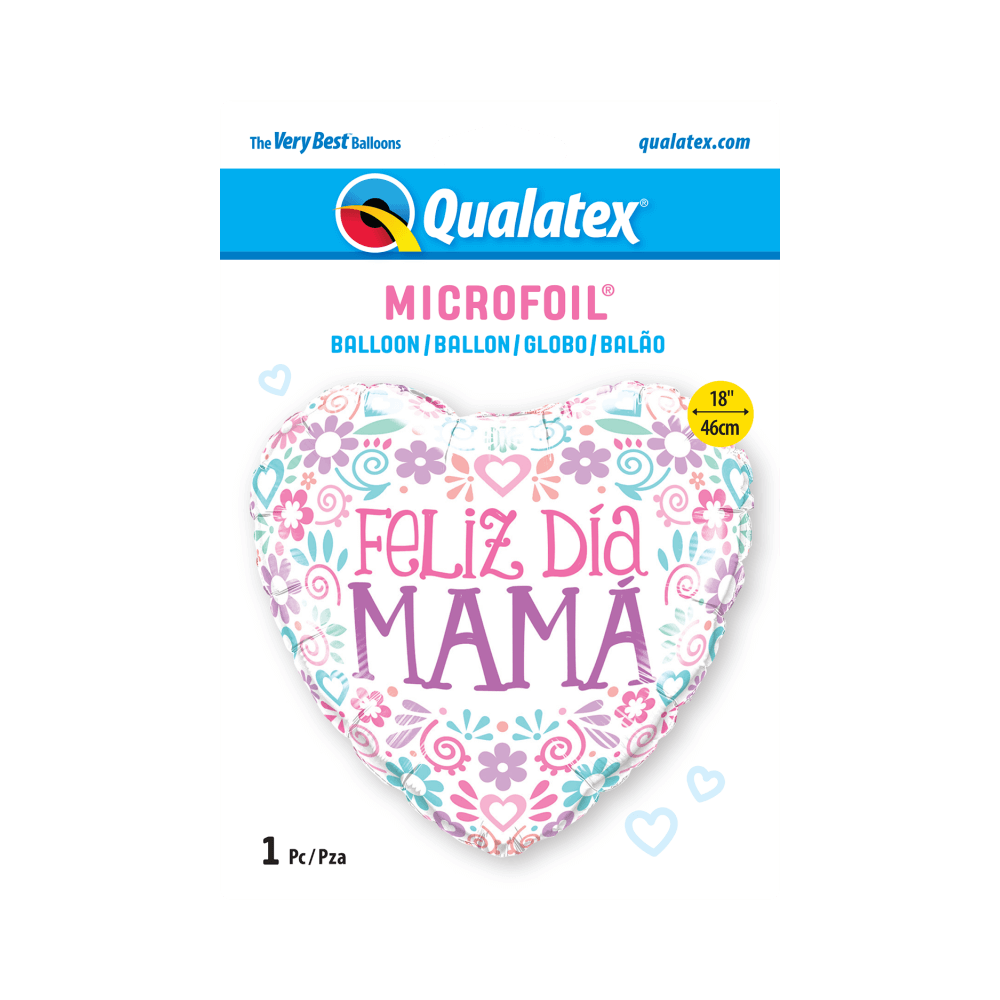 Globo de foil en forma de corazón decorado con un bonito mensaje "Feliz día Mamá", diseño blanco con flores y corazones impresas en color morado, rosa, azul y verde pastel, perfecto para que sorprendas a tu madre en el día de la madre o en su cumpleaños.