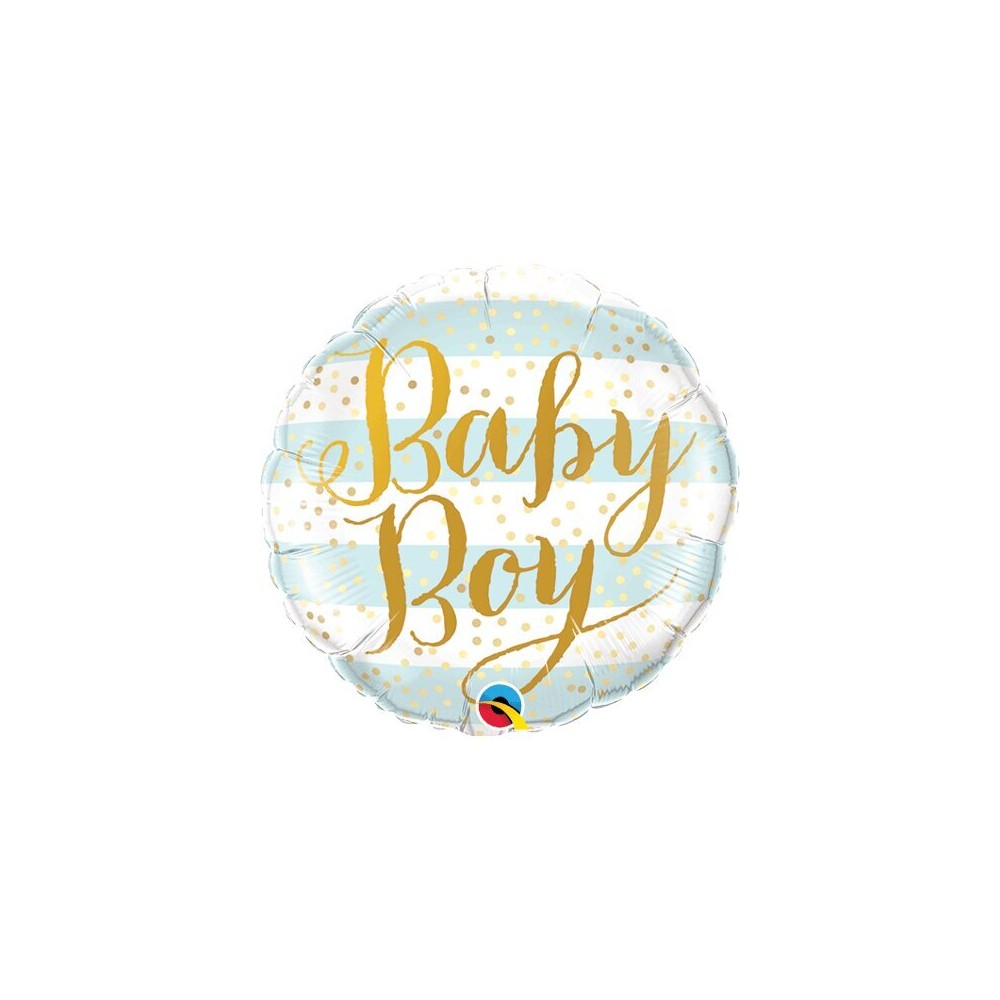 Globo de foil redondo con mensaje "baby boy" sobre un dulce diseño de rayas en color blanco - azul, perfecto para que decores de forma especial una fiestas de baby shower de niño o de revelación de sexo.