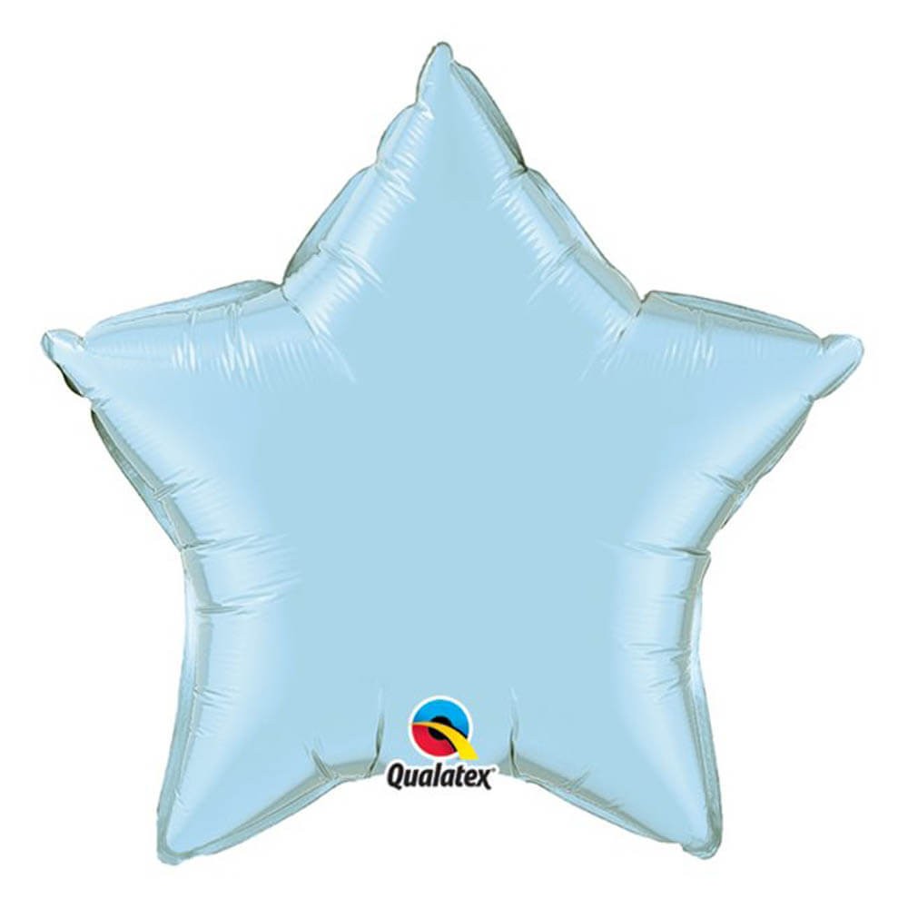 Globo de foil en forma de estrella de color azul claro acabado brillo, fabricado en papel de aluminio con válvula de auto sellado para mantener el aire, ideal para decorar todo tipo de fiestas y eventos.