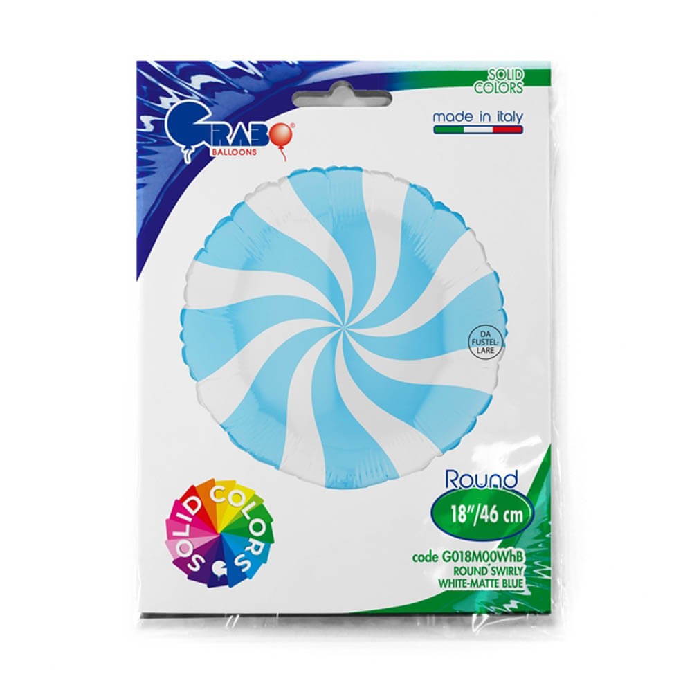 Globo de foil de la marca Grabo en formato redondo con un bonito diseño bicolor de espiral azul y blanco, ideal para decorar fiestas y eventos especiales.