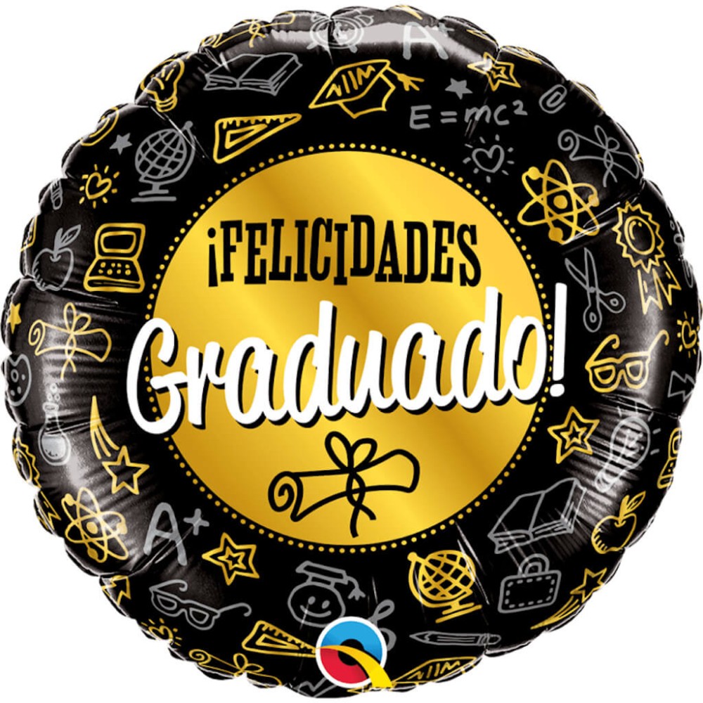 Globo de foil con mensaje "Felicidades graduado", lleva el centro dorado y el borde negro con dibujos de birretes, diplomas, maletines, ordenadores, reglas, ecuaciones, lápices..., perfecto para decorar fiestas de graduación.