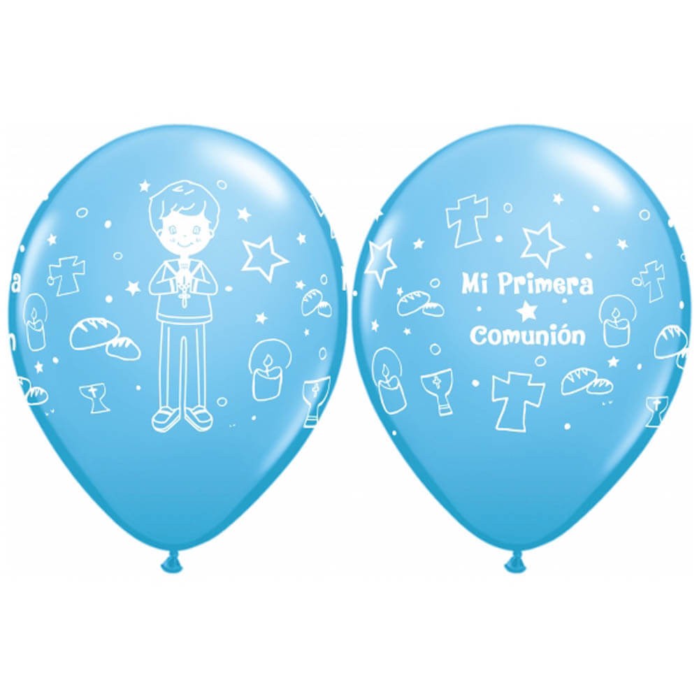 Globo de látex para comunión fabricado 100% en látex azul con una bonita impresión a dos caras de un niño de comunión e ilustraciones de símbolos de la comunión cristiana, cruces, panes y cálices en color blanco. Perfecto para decorar el espacio donde se celebre el evento de la primera comunión.