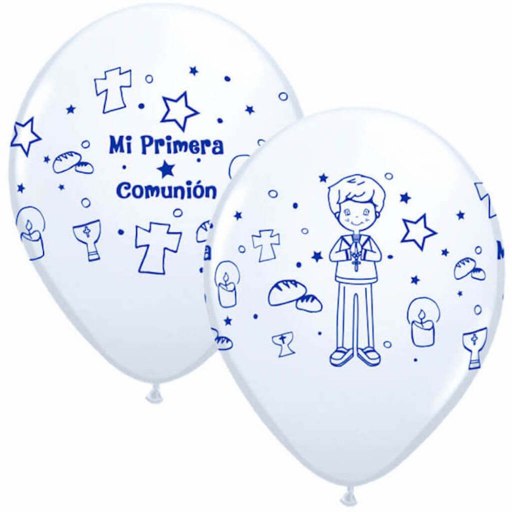 Globo de látex para comunión fabricado 100% en látex blanco con una bonita impresión a dos caras de un niño de comunión e ilustraciones de símbolos de la comunión cristiana, cruces, panes y cálices en color azul. Perfectos para decorar el espacio donde se celebre el evento de la primera comunión.