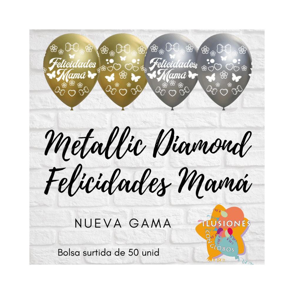 Globo en color plata u oro fabricado 100% en látex de alta calidad, diseño impreso con dibujos de flores, mariposas, lazos y la frase "Felicidades Mamá" sobre fondo liso metalizado, perfecto para armar un bonito ramo de globos para el día de la madre o para su cumpleaños.