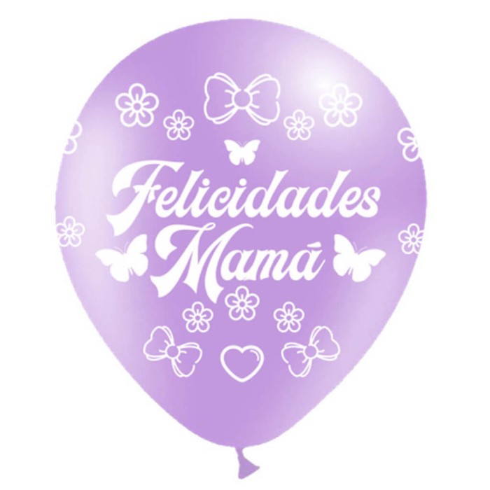 Globo en color rosa o lila fabricado 100% en látex de alta calidad, diseño impreso con dibujos de flores, mariposas, lazos y la frase "Felicidades Mamá" sobre fondo liso, perfecto para armar un bonito ramo de globos para el día de la madre o para su cumpleaños.