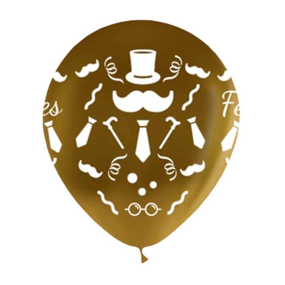 Globo en color plata u oro acabado metálico fabricado 100% en látex de alta calidad, diseño impreso con dibujos de corbatas, bigotes, sombreros, serpentinas y la frase "Felicidades Papá" sobre fondo liso metalizado, perfecto para armar un bonito ramo de globos para el día del padre o para su cumpleaños.