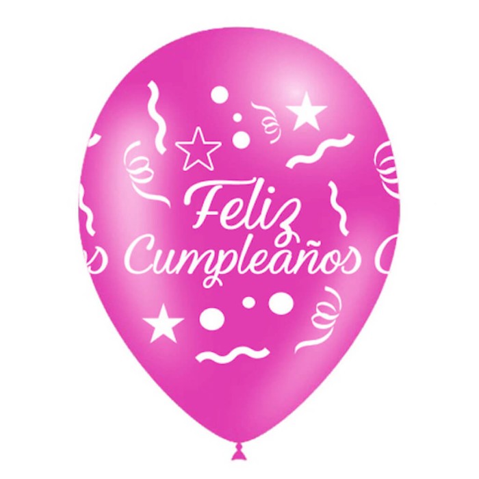 Globo feliz cumpleaños en color rosa, fabricado 100% en látex impreso con un diseño moderno de estrellas y serpentina.