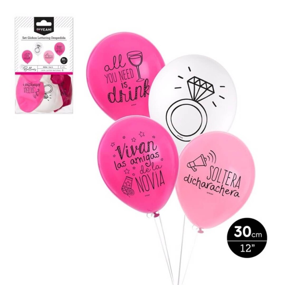 Globos de látex impresos con temática de despedida de soltera, 4 diseños surtidos, Vivan las amigas de la novia; Soltera dicharachera; All you need is drink y la silueta de un anillo de compromiso, diseño en tonos rosas.
